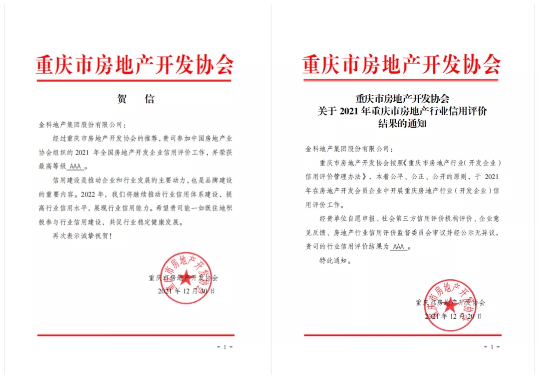 近日,中國房地產(chǎn)協(xié)會(huì)、重慶市房地產(chǎn)開發(fā)協(xié)會(huì)先后公布了2021年房地產(chǎn)開發(fā)企業(yè)信用評(píng)價(jià)等級(jí)結(jié)果。金科憑借在信用能力、信用記錄、信用建設(shè)等方面的優(yōu)異表現(xiàn),分別獲評(píng)全國房地產(chǎn)開發(fā)企業(yè)AAA級(jí)信用評(píng)價(jià)、重慶市房地產(chǎn)開發(fā)企業(yè)AAA級(jí)信用評(píng)價(jià),這也是今年中國房地產(chǎn)協(xié)會(huì)及重慶市房地產(chǎn)開發(fā)協(xié)會(huì)公布的信用評(píng)價(jià)最高等級(jí)。