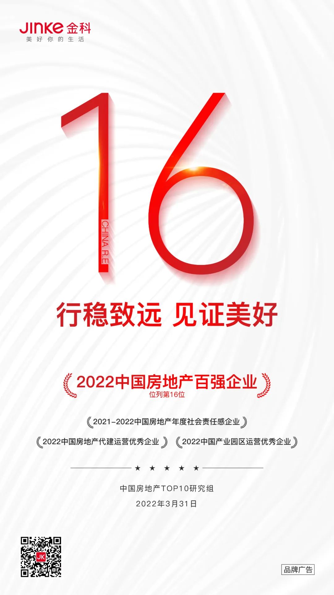 3月31日,由中國房地產(chǎn)TOP10研究組舉辦的“2022中國房地產(chǎn)百強企業(yè)研究成果發(fā)布會暨第十九屆房地產(chǎn)百強企業(yè)家峰會”在北京召開。大會發(fā)布了“2022中國房地產(chǎn)百強企業(yè)”榜單,金科憑借企業(yè)強勁的綜合實力與穩(wěn)健的高質(zhì)量發(fā)展,位列第16位,這也是金科自2005年以來連續(xù)18年獲此榮譽。