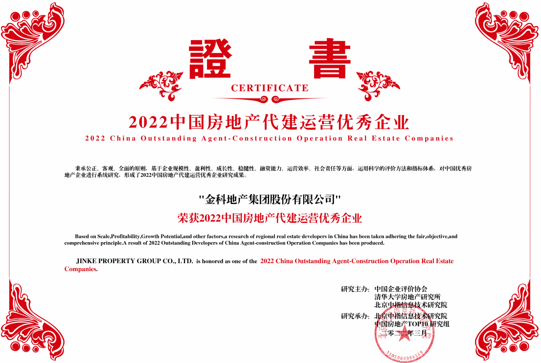 秉承“成就客戶、智造價(jià)值、建設(shè)信任”的合作理念,憑借專業(yè)化運(yùn)作及特色化代建合作模式,也讓金科代建多次獲得中國(guó)指數(shù)研究院“2022中國(guó)房地產(chǎn)代建運(yùn)營(yíng)優(yōu)秀企業(yè)”、鳳凰網(wǎng)“2022中國(guó)房地產(chǎn)代建企業(yè)領(lǐng)先品牌”等眾多專業(yè)機(jī)構(gòu)、媒體頒發(fā)的行業(yè)認(rèn)證殊榮。