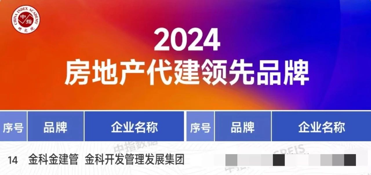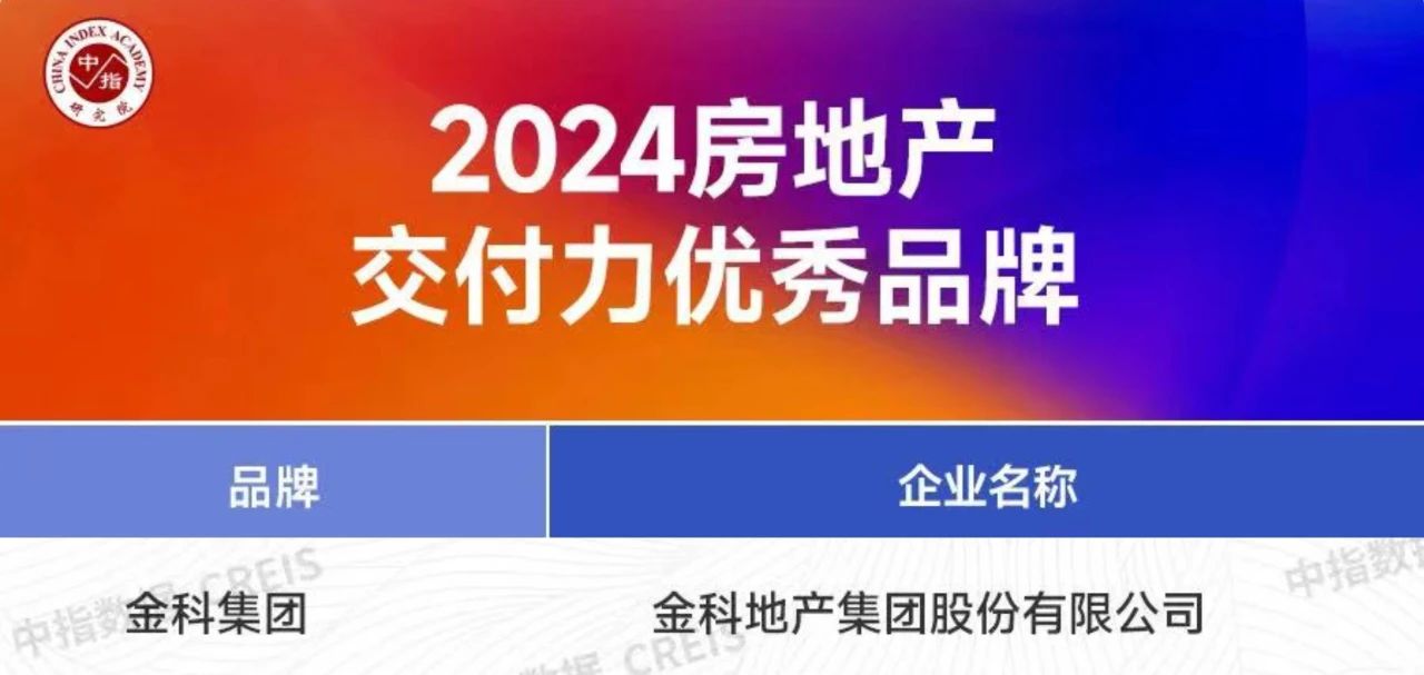9月13日,由中國企業(yè)評價協(xié)會、清華大學房地產(chǎn)研究所、北京中指信息技術(shù)研究院主辦的“2024中國房地產(chǎn)品牌價值研究成果發(fā)布會暨第二十一屆中國房地產(chǎn)品牌發(fā)展論壇”順利召開。金科憑借亮眼的交付成績及代建規(guī)模,榮獲“2024中國房地產(chǎn)交付力優(yōu)秀品牌”“2024中國房地產(chǎn)代建領(lǐng)先品牌”兩項殊榮。