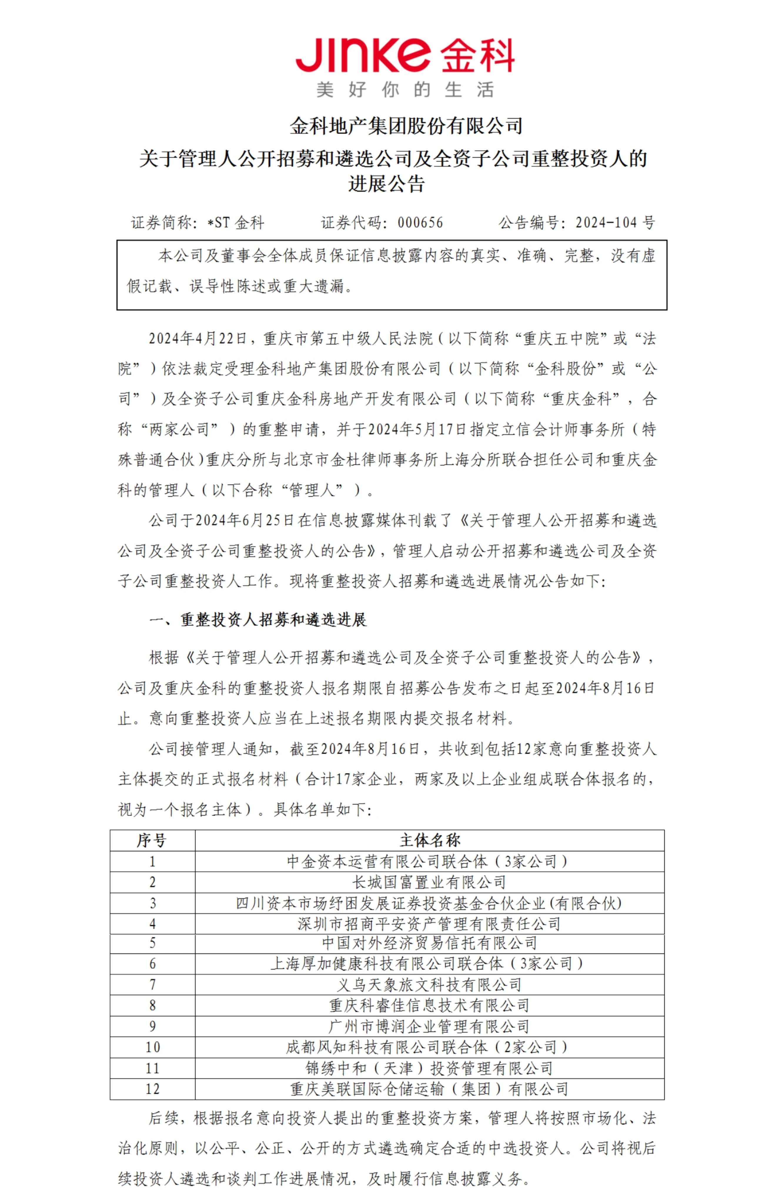 接下來,意向投資人應當于2024年9月24日前向金科股份管理人正式提交《重整投資方案》。根據(jù)報名意向投資人提出的重整投資方案,管理人將按照市場化、法治化原則,以公平、公正、公開的方式遴選確定合適的中選投資人。